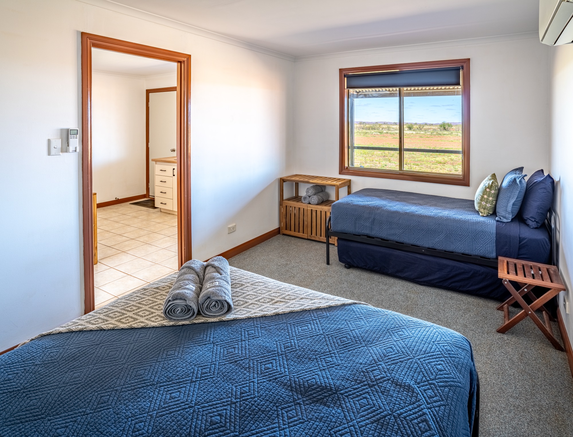 Air-conditioned unit with a mini fridge, queen bed, 2 single beds, trundle bed, black out blind, tea/coffee station, and linen. Meals are provided, unlimited ice, filtered water, washing machines, clotheslines & Wi-Fi.