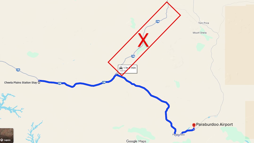 If travelling from the Paraburdoo Airport and/or Tom Price to Cheela Plains Station, DO NOT TAKE THE GRAVEL ROAD (Hwy 136) that is marked with a red cross on the map below. Google and Apple Maps will often direct travellers via the gravel road because it is shorter; however, it is a very rough gravel road and does not save time.